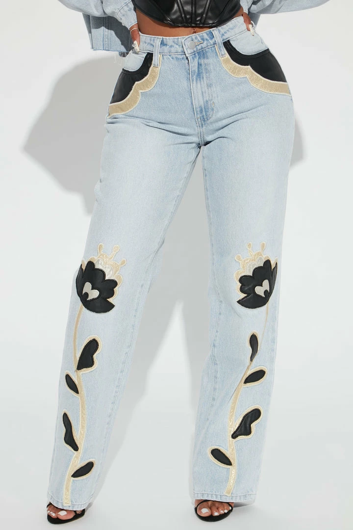 Budget π Fashion Nova Charley PU Patch Straight Leg π Jeans – Light Wash Matching Separates β¨